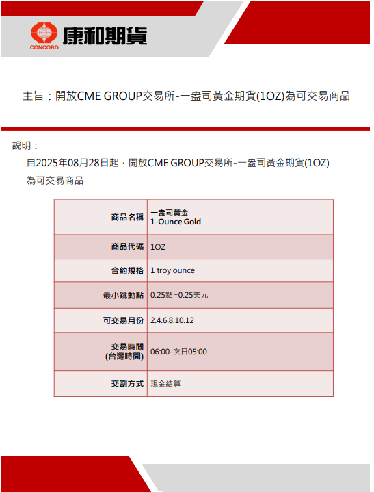 海期新商品 【一盎司黃金期貨 1OZ】 合約規格 最小跳動點 交易時間